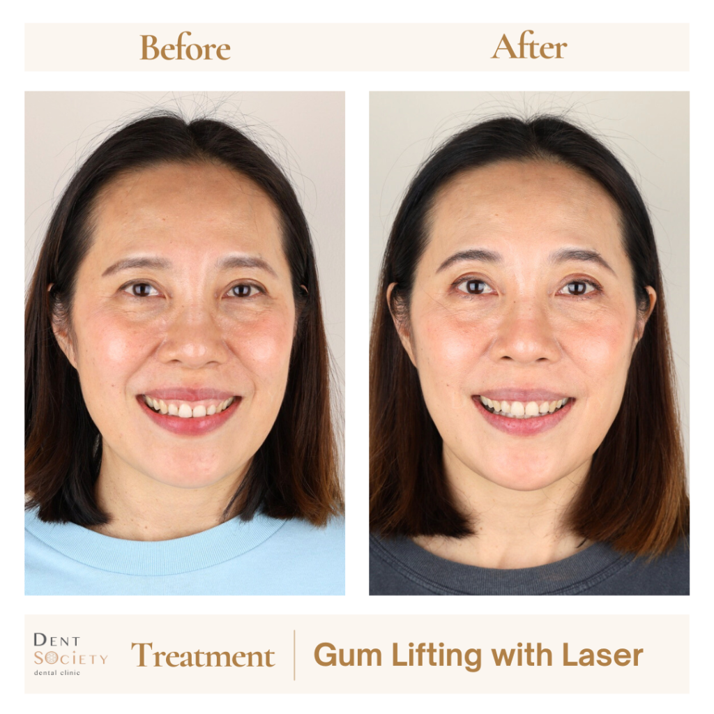 การเลเซอร์เหงือก เป็นการตกแต่งปรับแต่งรูปทรงของเหงือกที่งอกยาวหรือหนาเกินด้วย เครื่องเลเซอร์ Electrosurgery เพื่อให้ฟันดูยาวขึ้น โดยทันตแพทย์จะทำถ่ายรูป วิเคราะห์ความยาวของเหงือกที่จำเป็นต้องตัด โดยทันตแพทย์จะออกแบบตัดขอบเหงือกเฉพาะส่วนที่เกินออก